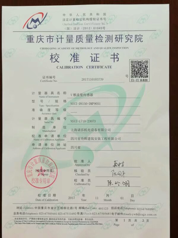 | 重庆市计量院多参量V锥流量计校准证书2017110103739P1 |