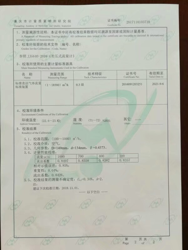 | 重庆市计量院多参量V锥流量计校准证书2017110103739P2 |