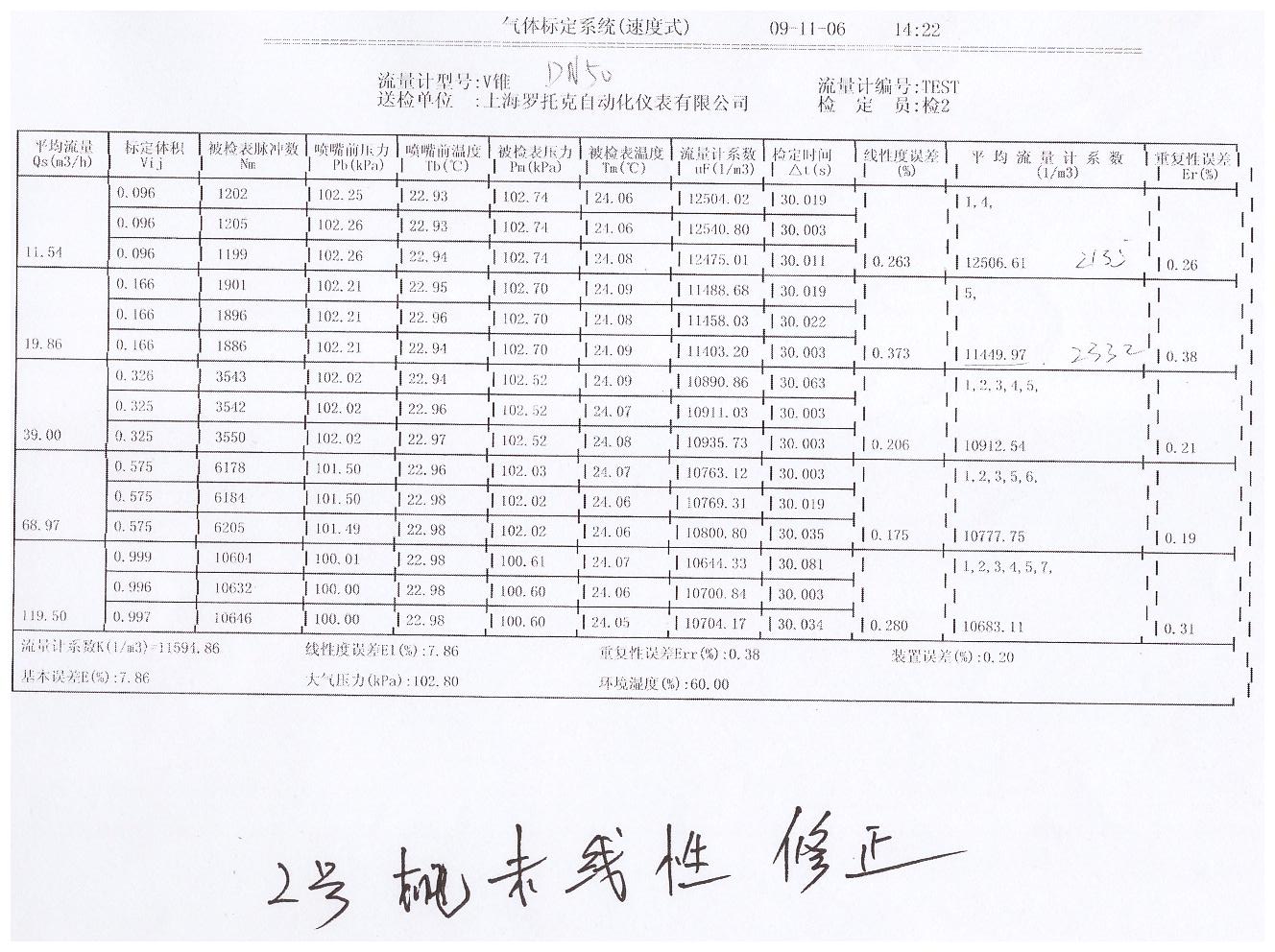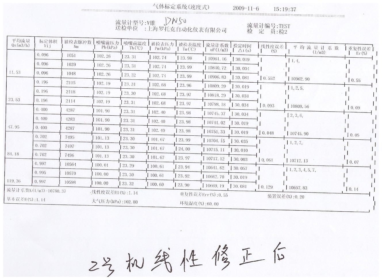 | 多参量V锥流量计喷嘴实验数据2号机线性修正2009年 |