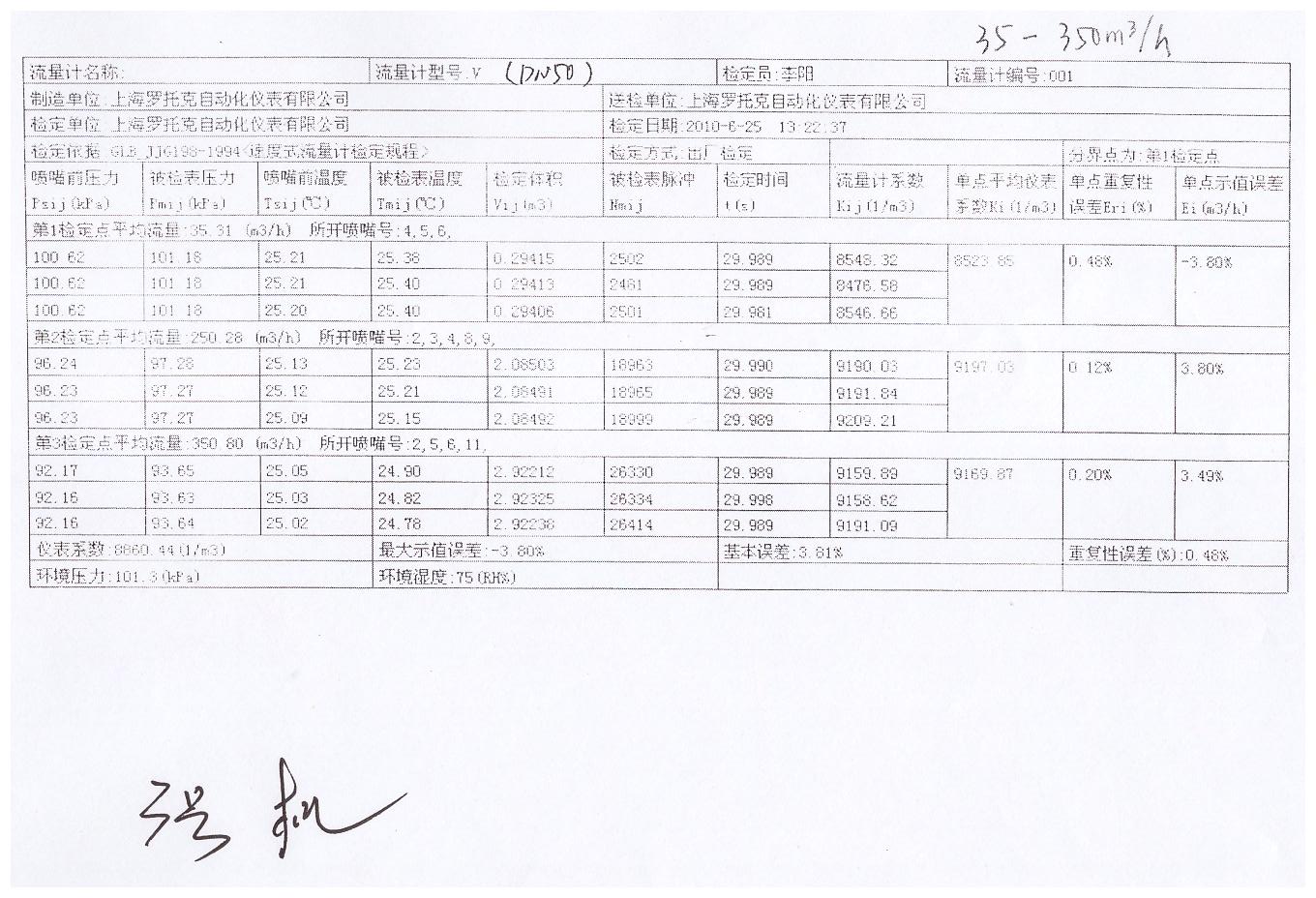 | 多参量V锥流量计喷嘴实验数据3号机35-350m3/h未线性修正2009年 |