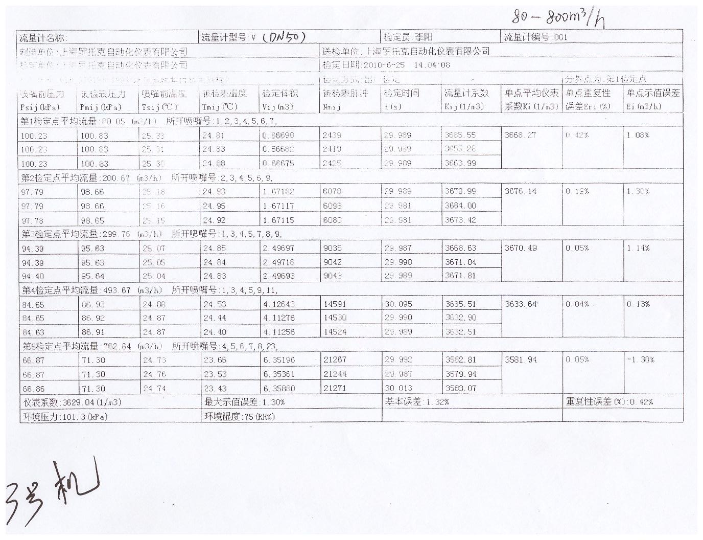 | 多参量V锥流量计喷嘴实验数据3号机80-800m3/h未线性修正2009年 |